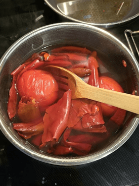 2. Put cooked chiles and tomatoes into a blender. Add ½ cup of chili water and blend until smooth.