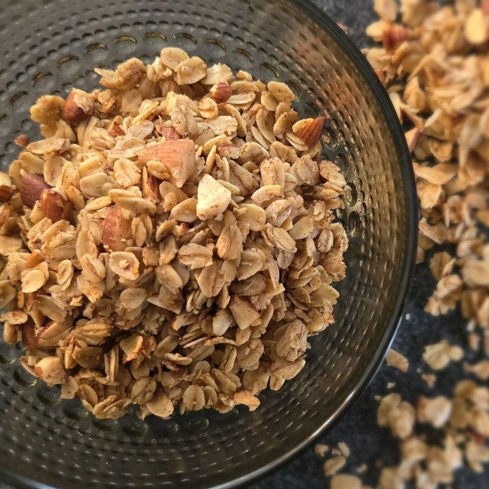 Need a quick granola with health benefits? Check out this Olive oil maple granola with high-quality extra-virgin olive oil (EVOO), old-fashioned oats, cinnamon, and almonds. It’s the perfect snack for breakfast, a topping for yogurt, or just a delightful treat on its own! But be careful, this granola is ADDICTING! You will definitely find yourself reaching for more!